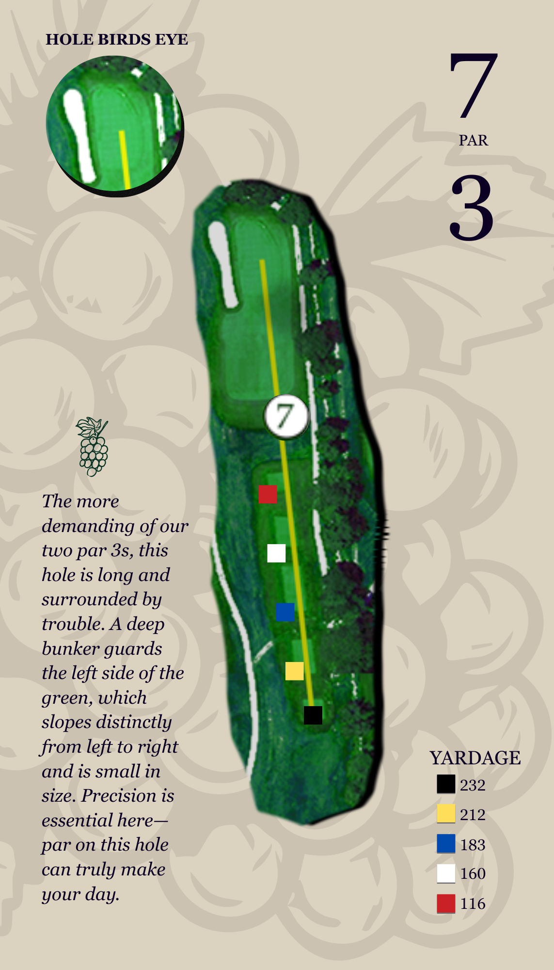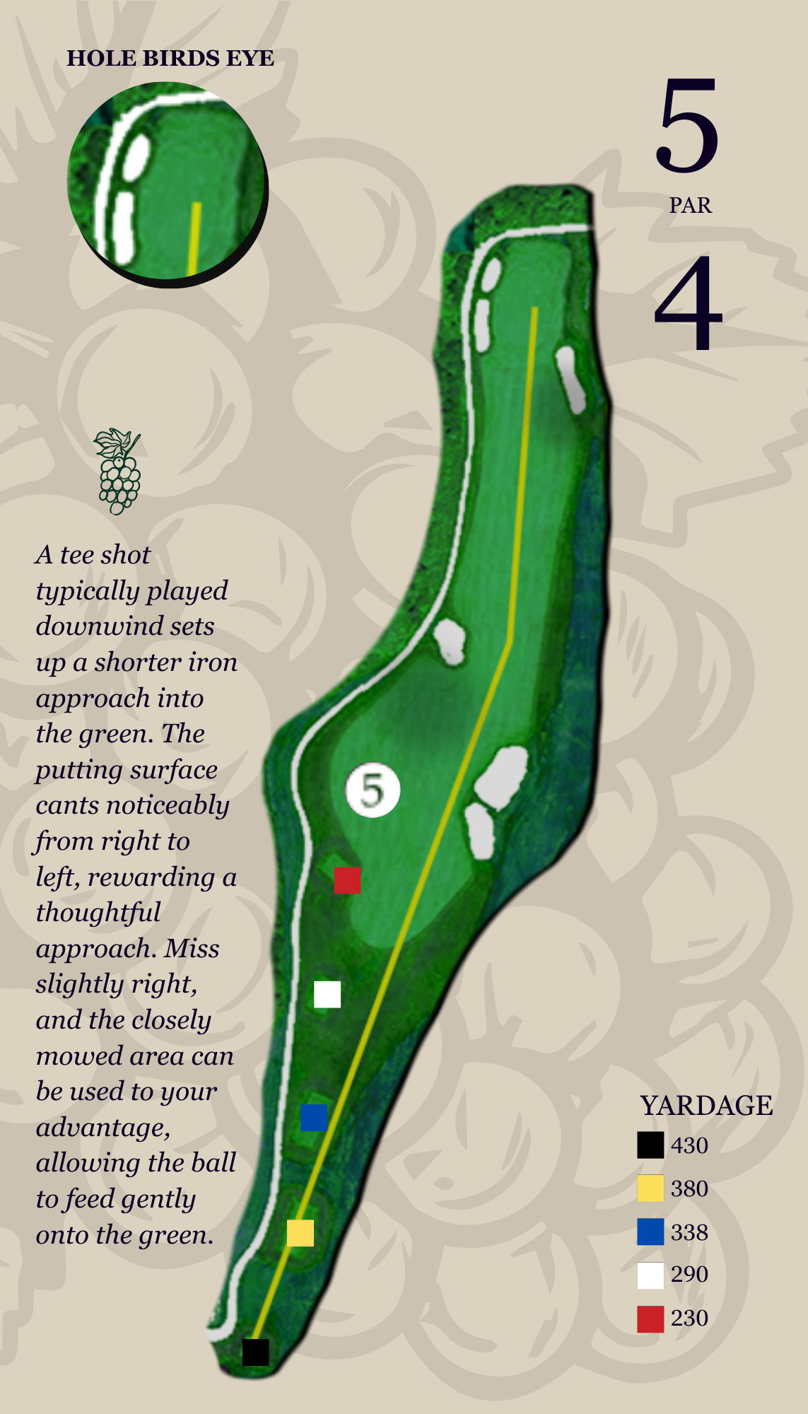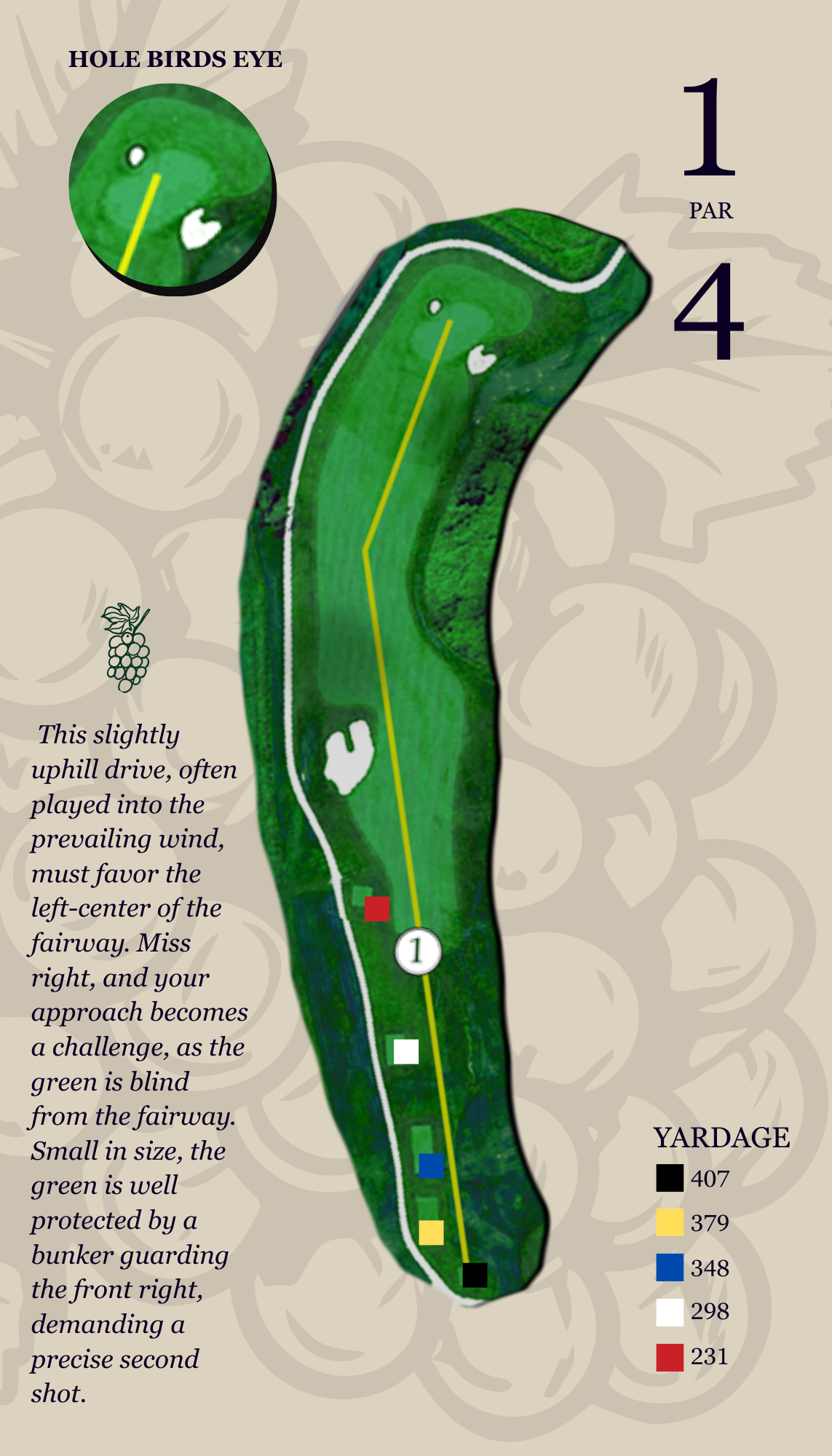 This slightly uphill drive, often played into the prevailing wind, must favor the left-center of the fairway. Miss right, and