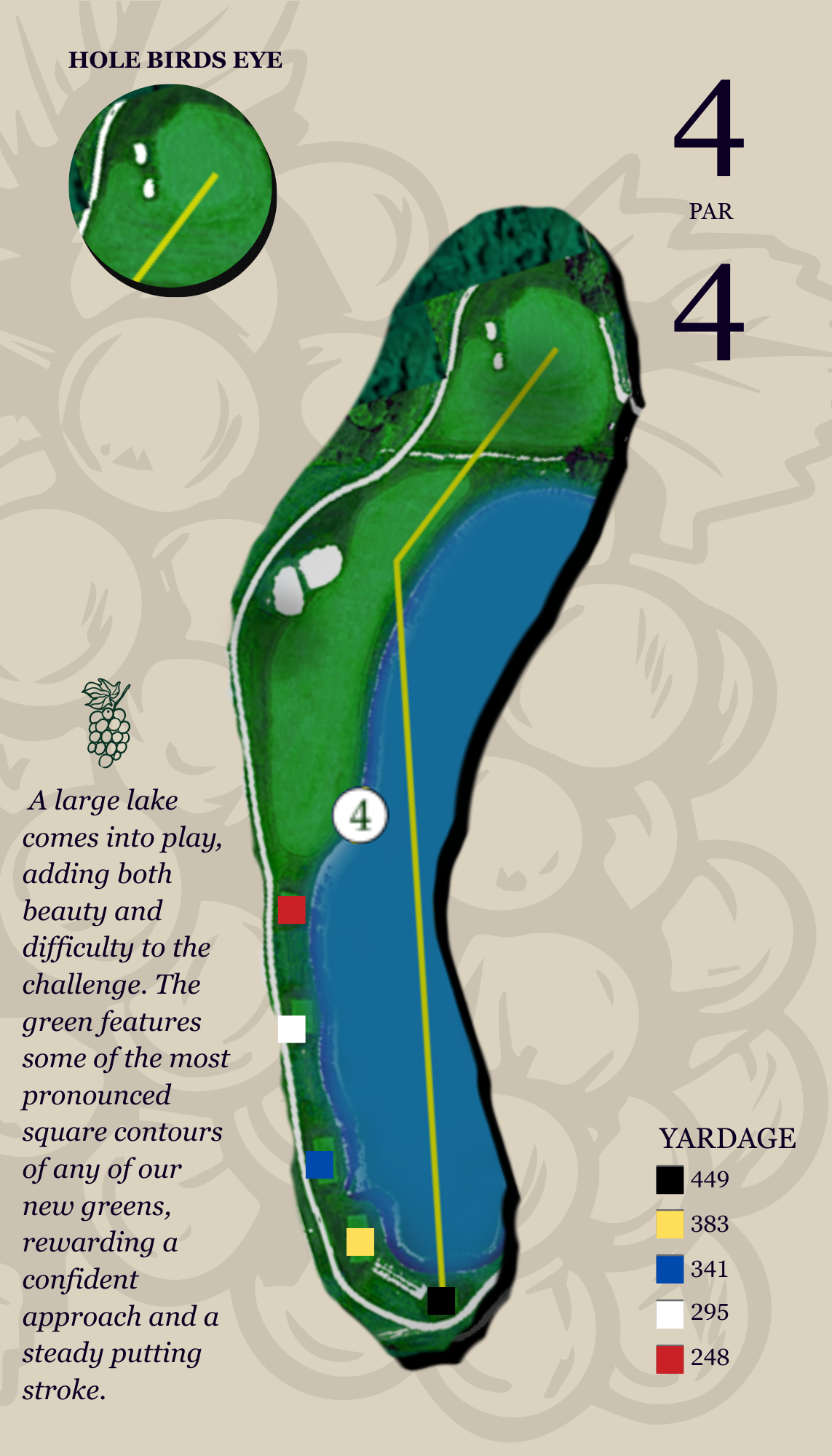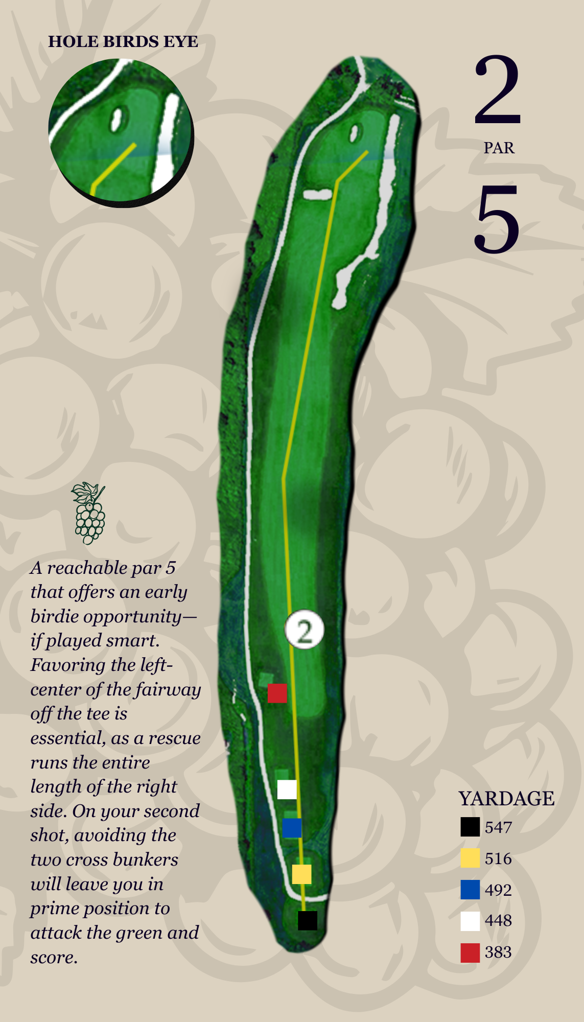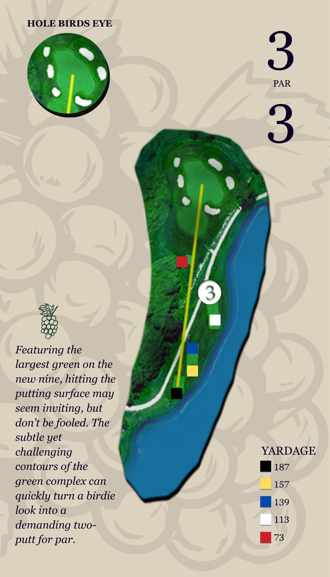 This slightly uphill drive, often played into the prevailing wind, must favor the left-center of the fairway. Miss right, and