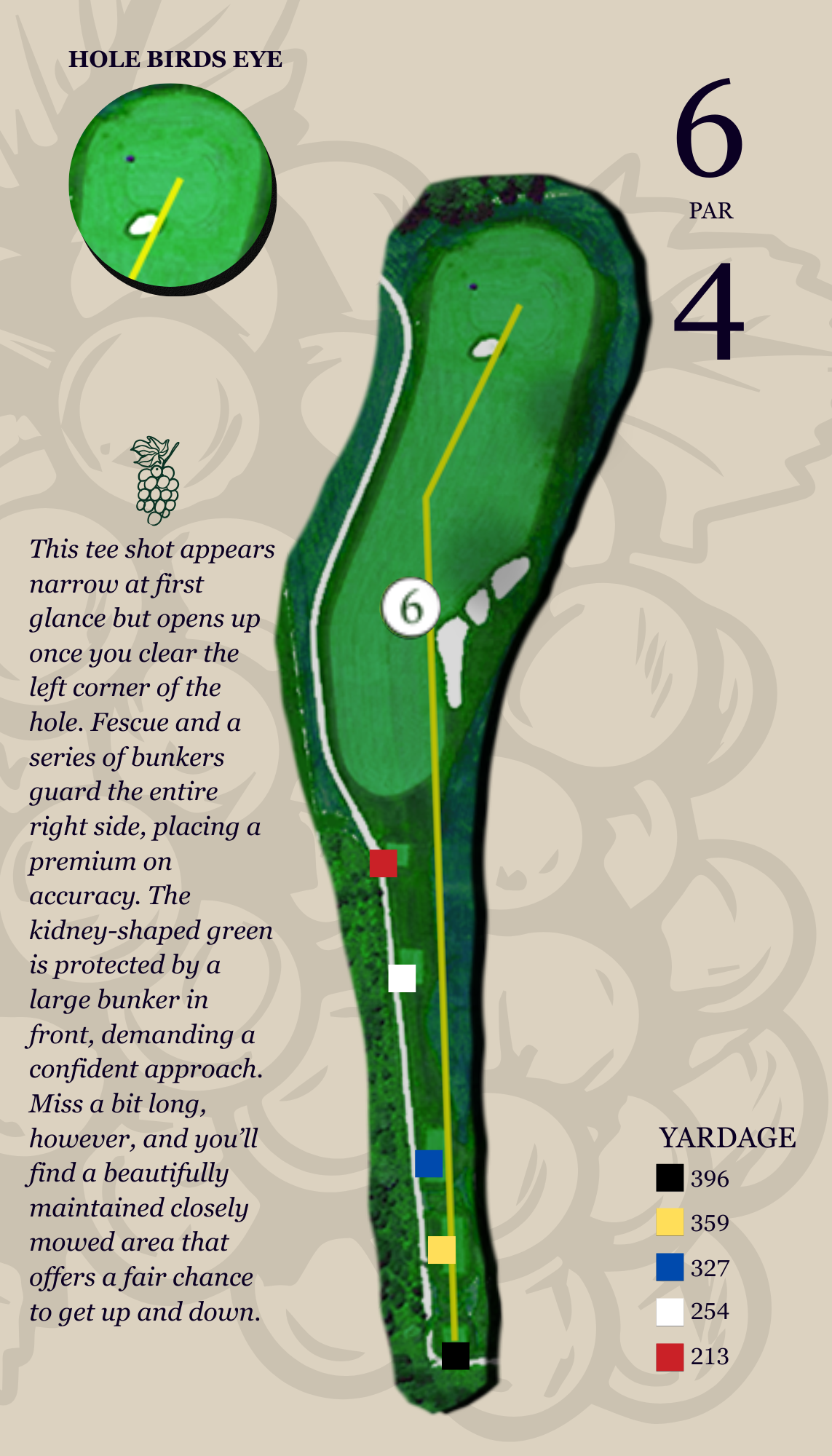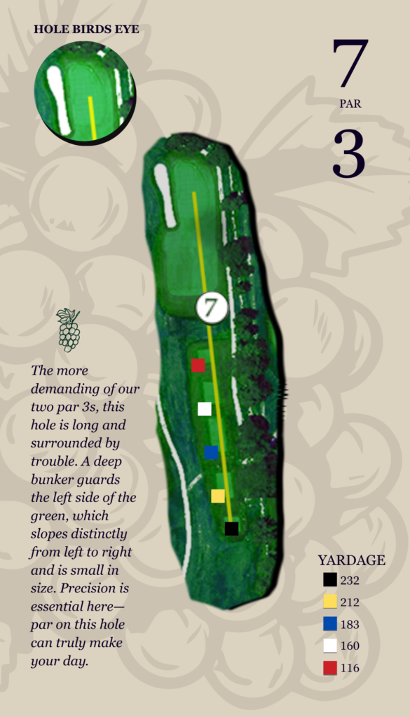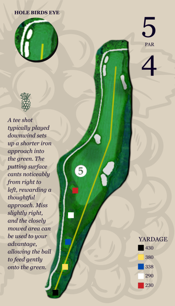 Fescue and a series of bunkers guard the entire right side, placing a premium on accuracy. The kidney-shaped green is protected by a large bunker in front, demanding a confident approach. Miss a bit long, however, and you’ll find a beautifully maintained closely mowed area that offers a fair chance to get up and down.