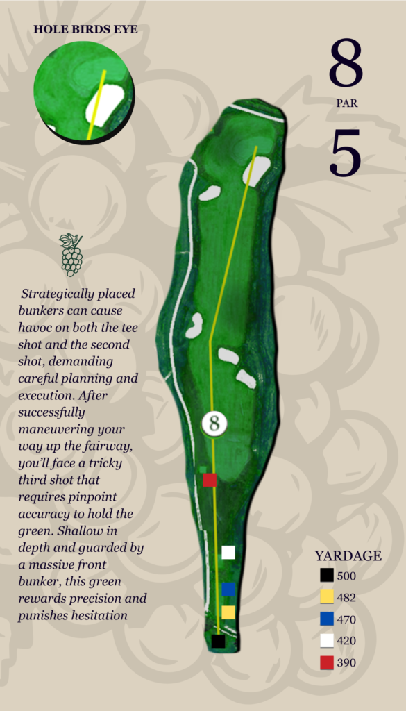 your approach becomes a challenge, as the green is blind from the fairway. Small in size, the green is well protected by a bunker guarding the front right, demanding a precise second shot.